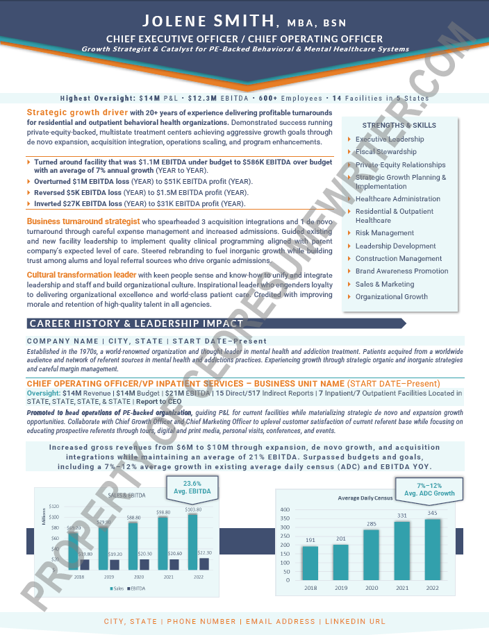 Written for a senior executive seeking a position as a Chief Executive Officer/CEO, or Chief Operations Officer/COO for private equity or venture capital-backed, healthcare technology companies. This sample executive resume was written with an emphasis on helping startups and healthcare services companies drive revenue.