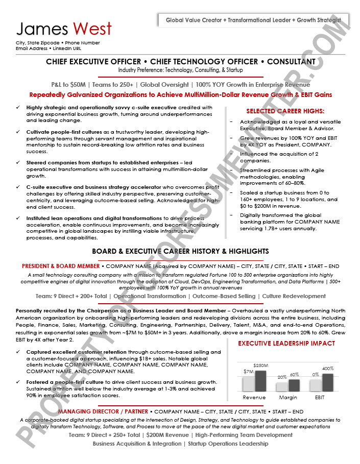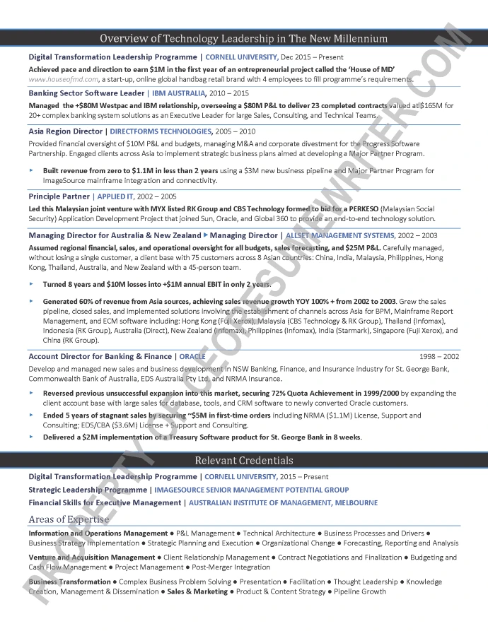 Executive resume sample written for a senior executive seeking a position as a Chief Executive Officer/CEO or President. This example executive resume was written for the technology industry with a focus on M&A/Mergers & Acquisitions leadership, private equity-backed companies, startups and turnarounds.