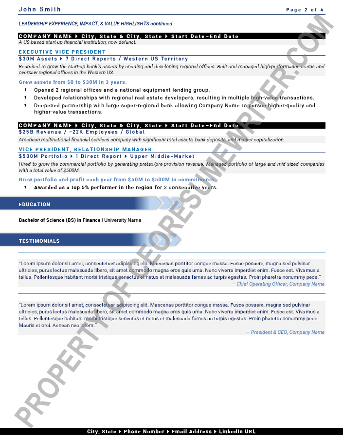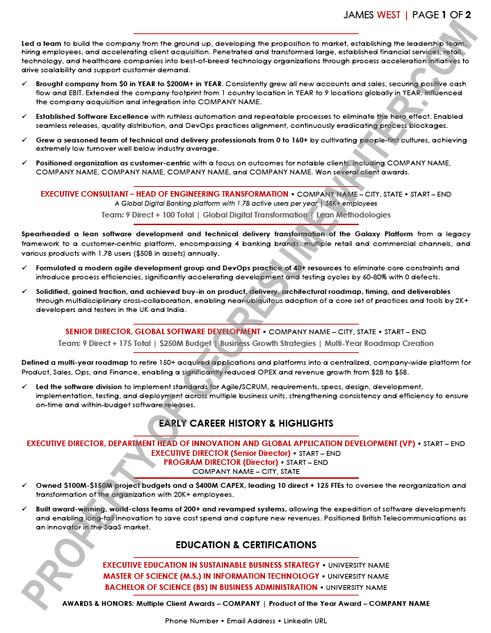 Written for a senior executive seeking a position as a Chief Executive Officer/CEO, or Chief Operations Officer/COO, Executive Director and Executive Vice President roles for major, multi-billion-dollar banking, finance, fintech and financial services companies. This executive resume example was written with an emphasis on leveraging emerging technologies and thought leadership in banking and finance.
