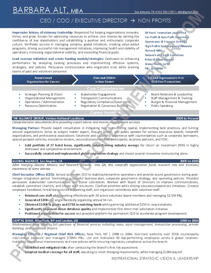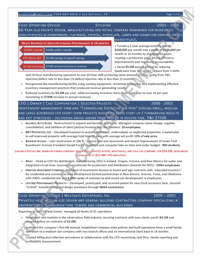 Example executive resume written for a senior executive seeking a position as a Global Chief Executive Officer/CEO or COO. This executive resume sample is geared towards high-growth industries in the consumer goods / retails industry with an emphasis on private equity / venture capital.