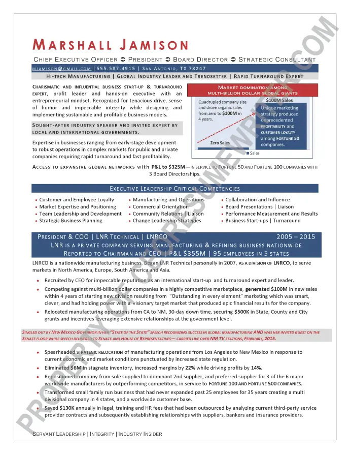 Written for a senior executive seeking a position as a Chief Executive Officer (CEO), or President for the high-tech manufacturing industry. This sample executive resume was written with an emphasis on private equity, Mergers & Acquisitions (M&As), turnarounds, global expansions and corporate growth optimization.