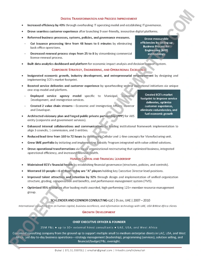 Written for a senior executive seeking a position as a Chief Executive Officer (CEO) or President for startups and major divisions. This sample executive resume was written with an emphasis on private equity consulting, Mergers & Acquisitions (M&As), turnarounds, global expansions and corporate growth optimization.