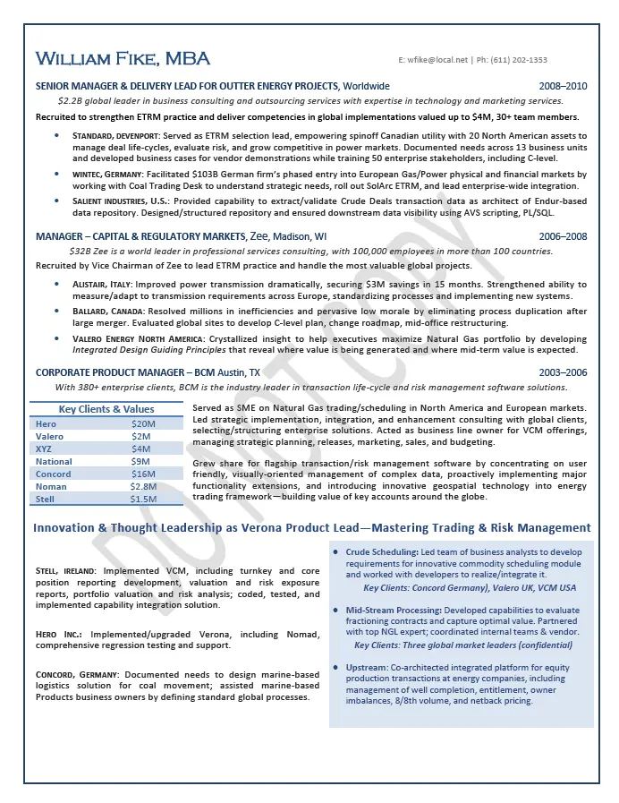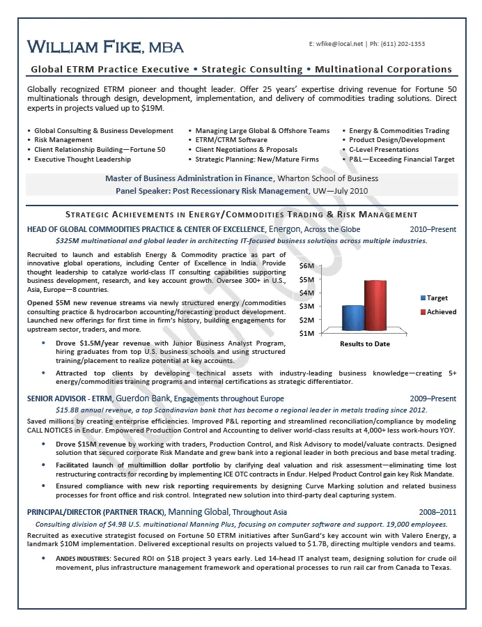 Written for a senior executive seeking a position as a Chief Executive Officer/CEO or President for global commodities trading. This example executive resume was written with an emphasis on Fortune 50 companies, strategic consulting, ETRM practice executive and multinational corporations/MNCs.