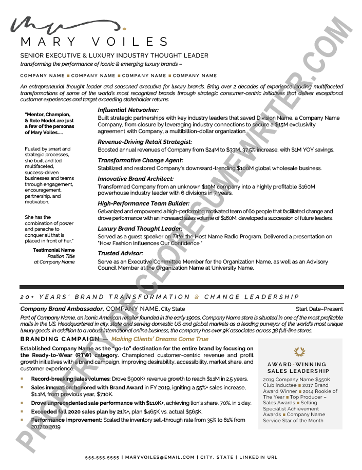If you are a Director, VP, CxO, or Board Member interested in an executive resume package or working directly with Mary Elizabeth, click below to schedule a complimentary 15-minute call with one of our team members