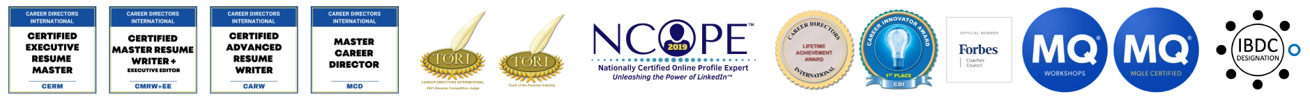4 CDI TORI Nominations and 2 TORI Awards (the highest peer-judged resume writing award in the careers services industry).