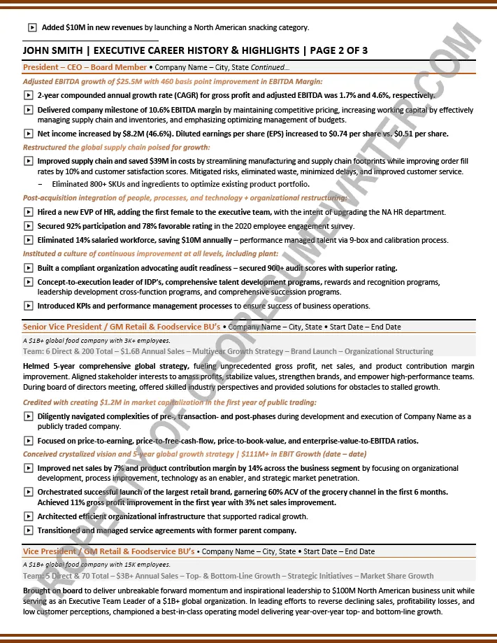 Written for a senior executive seeking a position as a Senior Advisor to corporate boards, corporations or Board of Directors for top restaurant brands and global food franchises. This sample executive board resume was written with an emphasis on pricing structures, strategic initiatives and thought leadership for global food franchises.