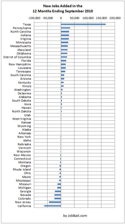 I got a tip from my friend Mark Hovind, President of Jobbait.com. Here is what he shared with me: Texas added more new jobs in the last 12 months than the next 5 highest states combined. Check out the graph below. ????