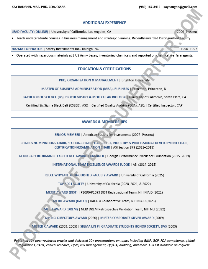 Written for an executive seeking a position as a Chief Quality Officer. This executive resume sample was written with an emphasis on global teams, pharma, biotech, life sciences, and clinical research for mid-sized to large companies.