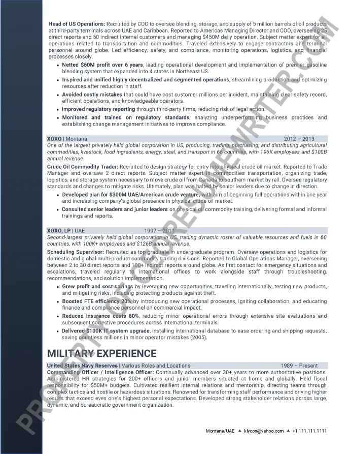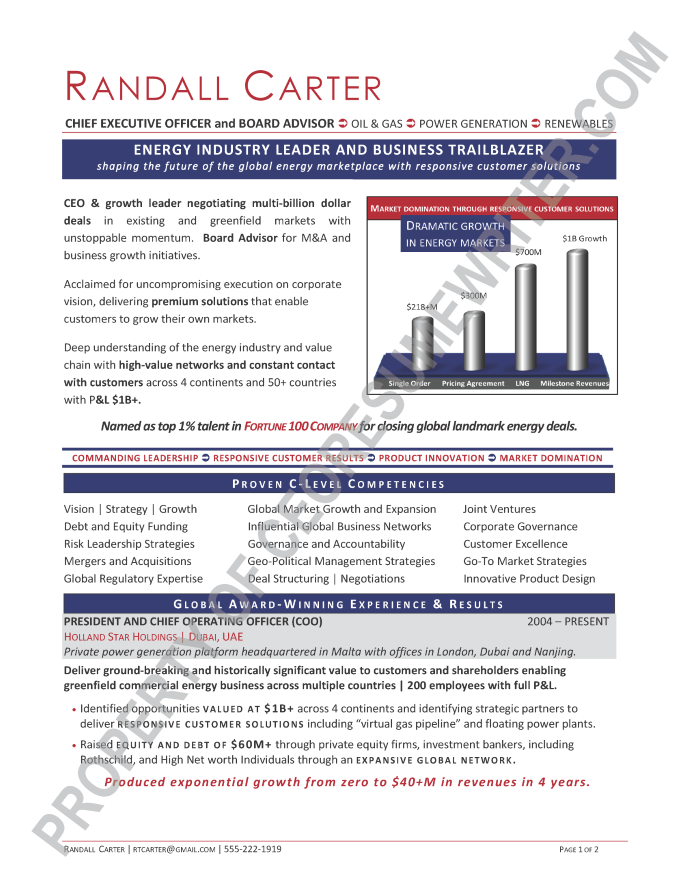 Executive board resume sample written for a senior executive seeking additional paid board appointments, CEO or COO roles in the energy, defense, security and oil and gas industries. This sample resume emphasizes leadership skills in transformation strategic planning and crisis management.