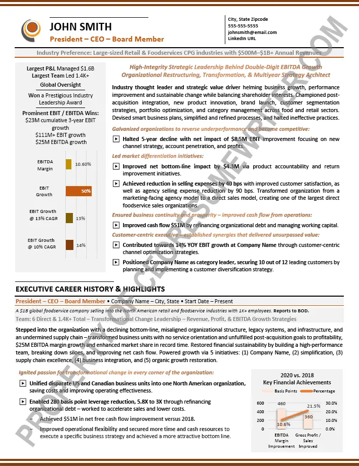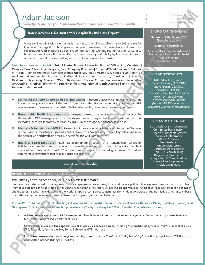 Written for a senior executive seeking a position as a Senior Advisor to corporate boards, corporations or Board of Directors for top restaurant brands and global food franchises. This sample executive board resume was written with an emphasis on pricing structures, strategic initiatives and thought leadership for global food franchises.